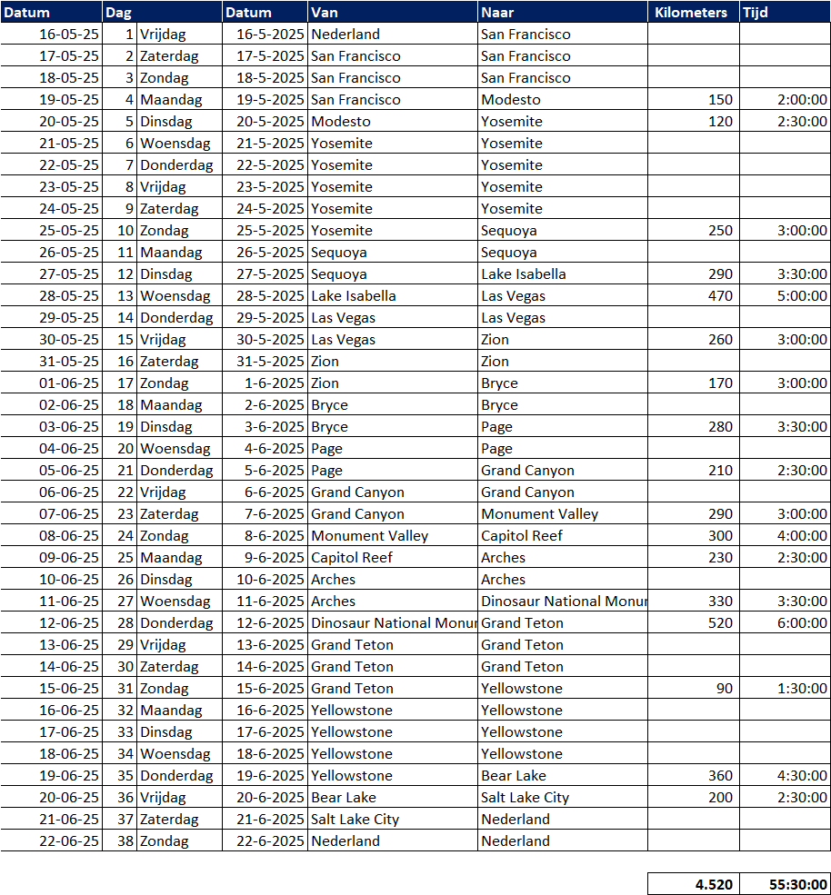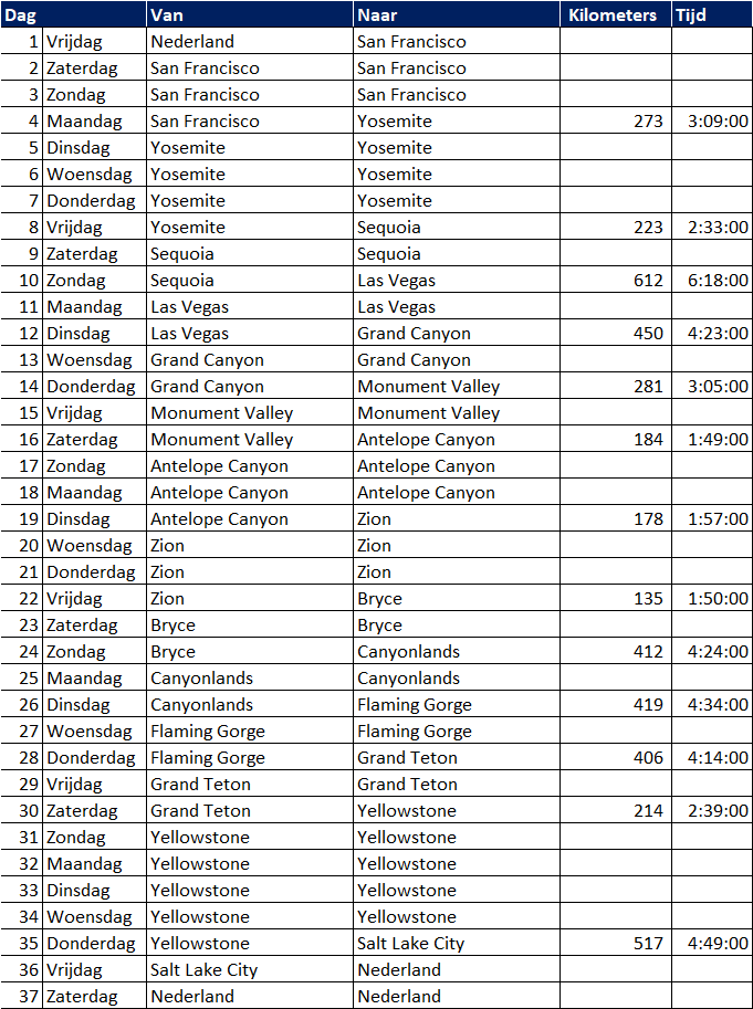 We willen de 'bekende' parken (Bryce, Zion, Grand Canyon, Antelope, Arches, Canyonlands, Monument Valley) bezoeken maar ik twijfel of het haalbaar / verstandig is om zowel Yosemite als Yellowston in de reis op te nemen. Ik heb een schema gemaakt en het lijkt wel te kunnen zo, maar ik ben zeer benieuwd wat de mening van de kenners hier is! De reistijd is gebaseerd op google en ik realiseer met dat er met de camper wel wat tijd bij komt. Om kilometers te besparen ben ik uitgegaan van een one way / open jaw.
