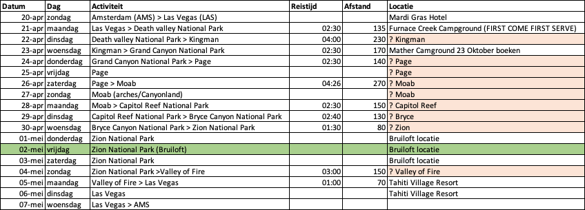 Onderstaand onze huidige planning. We hebben de vlucht, camper en hotels in Las Vegas inmiddels vastgelegd. De hotels hebben free cancellation zodat we indien nodig op een later tijdstip nog kunnen wijzigen indien er betere opties zijn (we komen met pasen aan en die dag is er al heel veel vol).