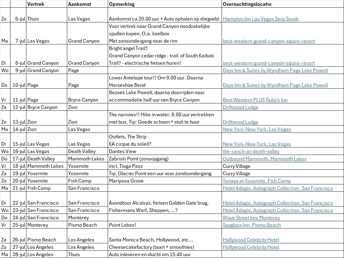Tickets en accomodaties liggen vast (accomodaties nog te annuleren) en heb al heel wat 'notities' gemaakt met ideeen hoe de dagen in te vullen. Hikes, shoppen voor onze dochters en eventueel nog een show in Las Vegas?