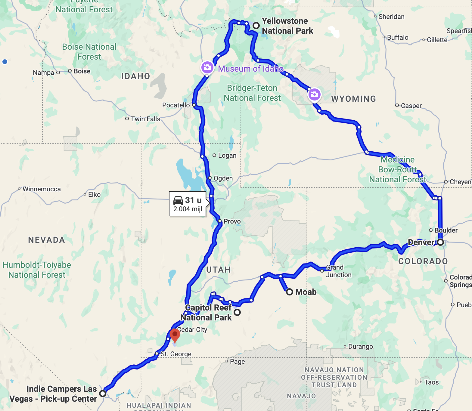 Precies, schrijf het eens per dag uit, dan is het veel sneller duidelijk wat er wel of niet mogelijk is. Je ziet dan ook wat de reisdagen zijn. En dat is wel nuttig, want je hebt niet echt veel dagen over met deze planning. Bedenk ook dat bijvoorbeeld een volle dag Denver betekent dat je er twee nachten bent. Maar ik zou zeker niet die hele omweg voor alleen Denver gaan maken, of is daar een speciale reden voor? Misschien een paar dagen Rocky Mountain NP? Of doe iets minder tijd voor Yellowstone en Zion en besteed meer tijd aan Colorado. En zijn twee dagen (bedoel je dan 3 nachten?) Canyonlands nodig?