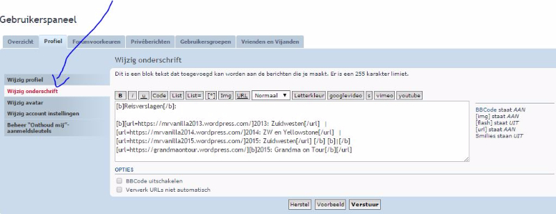 Hoi, als je rechtsboven in beeld op je gebruikersnaam klikt kun je naar gebruikerspaneel gaan. In een van de subtabs zie je dan Profiel staan. Als je daar op klikt komt links 'onderschrift' te staan. Daar kun je je onderschrift aanpassen.