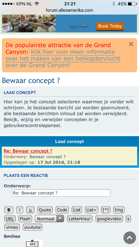 Ik was bezig met een reactie in het forum, maar moest toen weg van mijn PC. Dus ik klik op "Bewaar Concept", met het doel om het bericht later af te maken en te posten. Nu kom ik terug in het topic, maar ik kan nergens mijn bewaarde bericht vinden.