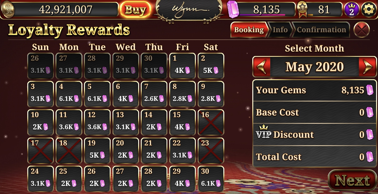 Ik speel op 2 accounts, die van mijn vriend en die van mezelf. Ik had vrijdag op alle twee de accounts 4000 vippunten gespaard en de overige 6000 punten om level 2 te halen heb ik gekocht voor 65 euro per account. Ik moet nog boeken (ik moet op 1 account nog ongeveer 250 gems bij elkaar spelen) maar als alles goed gaat dan zitten we in Mei 6 nachten in de Wynn voor 130 euro. Voor mij is dat het wel waard.
