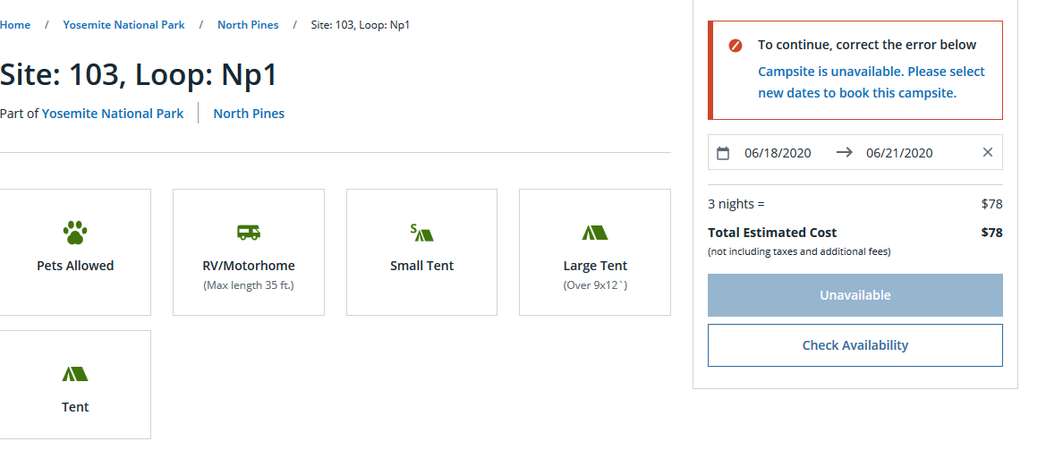 Dit was bij Tuolumne Meadows vorige maand ook al het geval. Gelukkig had ik om 16.25 uur geluk dat ik zag dat de 27ft campsites al wel werkten. Meteen de laatste plek geboekt en nog gelukt ook! Ik heb de captcha weten te omzeilen door steeds van browser te wisselen ;). Meteen erna sloten ze de boeking tot 17u.