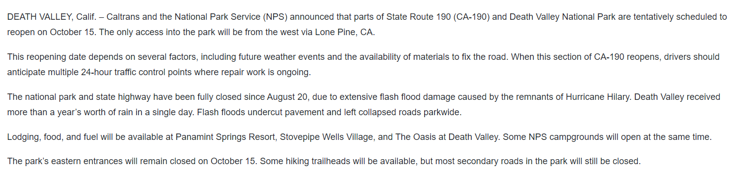 Heel goed nieuws uit Death Valley. Ook via het oosten bereikbaar, in tegenstelling tot de eerdere berichtgeving. En verschillende bezichtigingen open. Die bevestiging was er ook nog niet tot nu toe volgens mij.