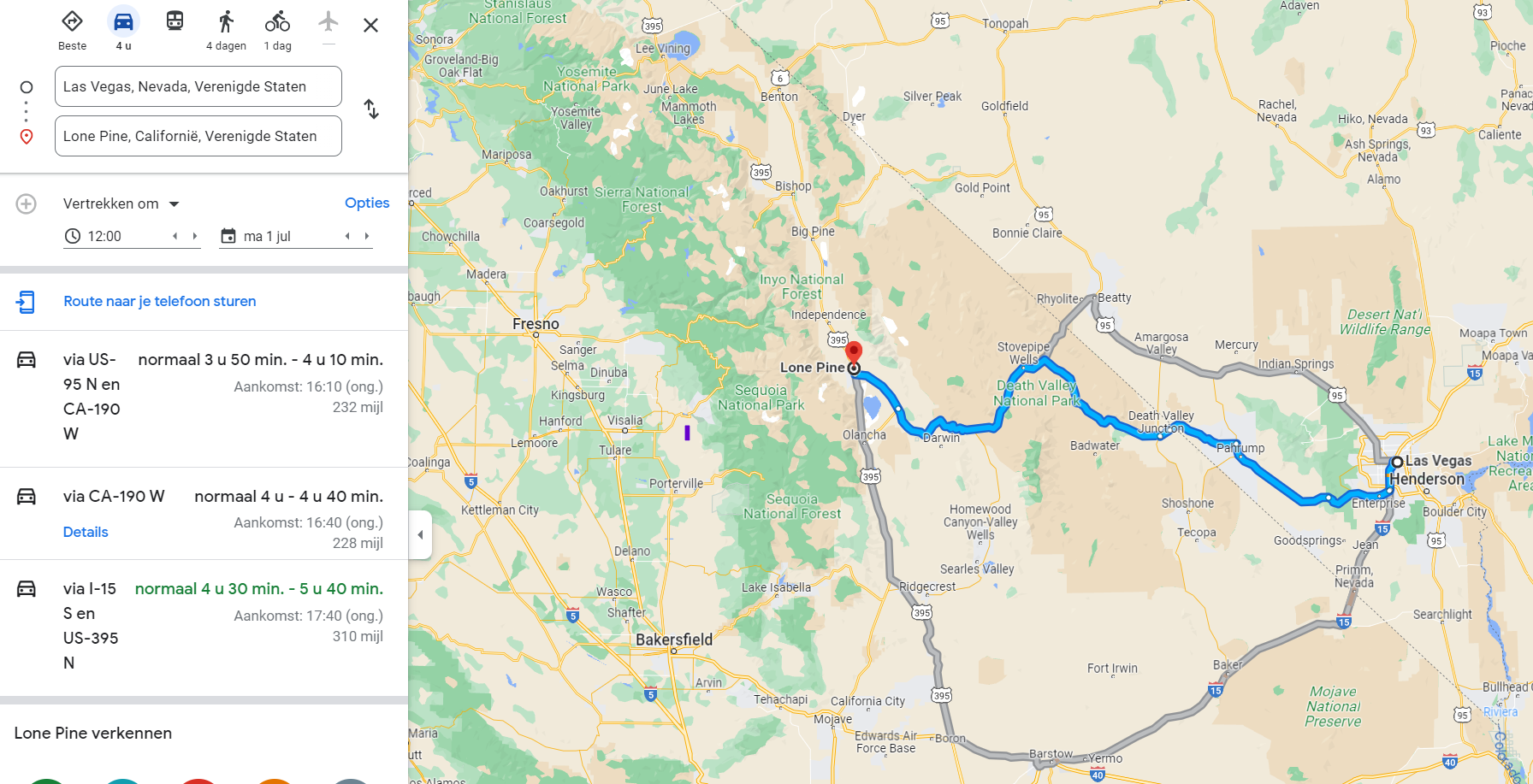 Gezien Death valley nog altijd niet doorrijdbaar is van bv lone pine naar Las Vegas kan ik in google maps niet simuleren hoe lang de rit eigenlijk is. We gaan pas in de zomer dus dan is het hopelijk terug mogelijk om van Lone Pine naar Las vegas te rijden door Death valley. Weet iemand hoe lang die rit normaal duurt (zonder stops)?