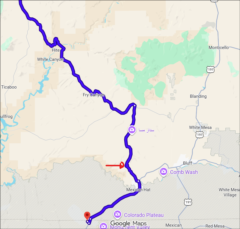 Als je rechtstreeks van Hite naar MV rijdt rij je via de Moki Dugway. Dat is een dirt road maar goed te doen. Je kunt die eventueel vermijden door via de 191 (richting Blanding) te rijden. Zie het kaartje; de Moki Dugway is bij de pijl.