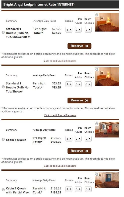 Voor onze reis richting westkust in september/oktober ben ik al een beetje aan het uitkijken naar accomodatie in de Nationale Parken. In Yosemite hebben we intussen Curry Village vastgelegd, volgende overnachting die ik wil regelen is nabij de Grand Canyon. Ik had daarover nog een praktische vraag. Onze voorkeur gaat uit naar Bright Angel cabins of lodge. Als ik op de site http://www.grandcanyonlodges.com kijk, lijkt alles al volzet te zijn. Via http://www.grandcanyontours.com daarentegen vind ik wel nog vrije kamers. Cabins kosten 161 dollar, kamers met toilet + bad in de lodge zijn 126 dollar.