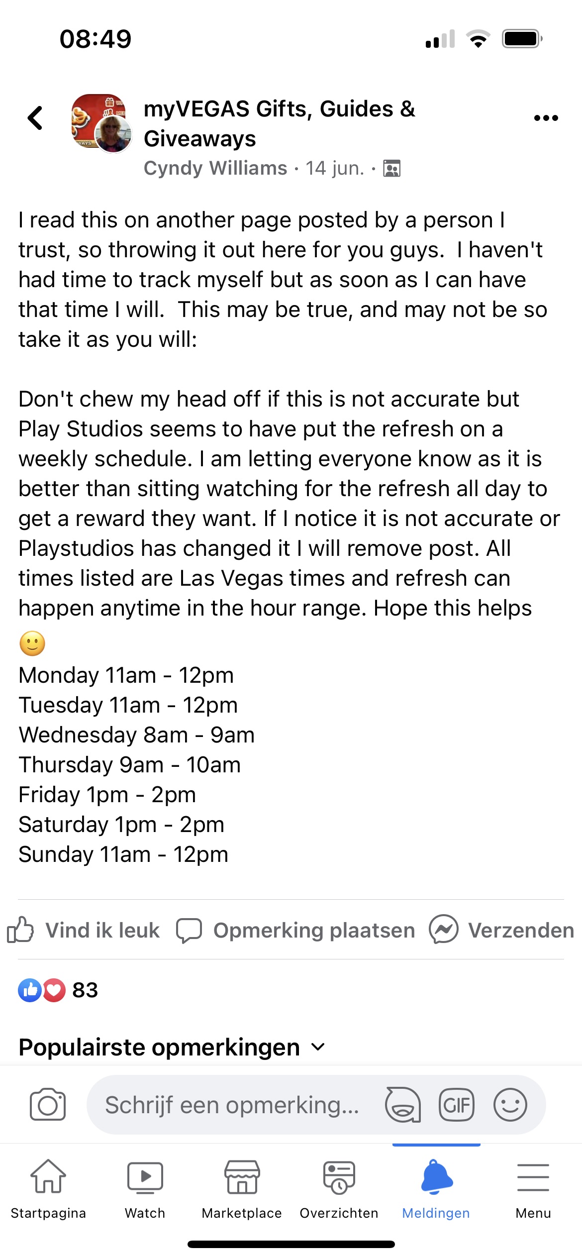 Dat zijn niet de exacte tijdstippen, aangezien de dagelijkse refresh handmatig wordt gedaan en daarom iedere dag op een iets ander tijdstip is. Op de FB-groep van MyVegas is er een refresh thread waarop de exacte tijd wordt gepost iedere dag.georgesken schreef: ↑14 aug 2022, 14:34Als je hier een paar pagina’s terugleest zie je de dagelijksé exacte tijdstippen. Dit is nog veel te ruim…