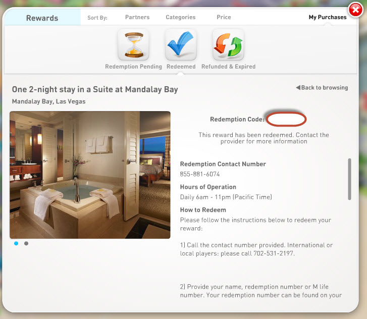 In je mail staat dus wat je geredeemed hebt. Met een Redemtion Code. Nu heb je 90 dagen om het aangekochte product aan te kopen'. Let wel even op dat als je naar amerika belt dat ook in Vegas niet alles 24-7 bereikbaar is, dus het helpt vaak om hier 's avonds na 20u te bellen. Als je belt krijg je meestal een bandje die je naar het goede hotel lootst, alvorens je iemand aan de lijn krijgt die je verder helpt.