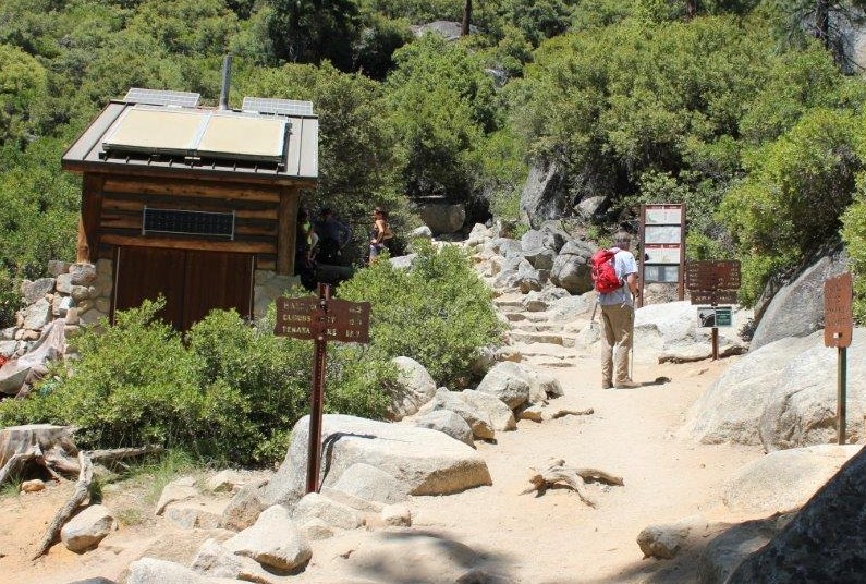 Hier een foto van de plek waar het steile pad langs de Nevada fall begint (links op de foto). Je moet voorbij de brug nog iets doorlopen, naar de toiletgebouwen. Vanaf dit punt is het naar de vallei via de JMT 1,5 mijl langer dan via de Mist Trail. Voor jullie maakte het minder uit omdat je niet naar dit punt bent gelopen en omdat je vanaf de Vernal Fall wel de Mist Trail hebt gelopen.