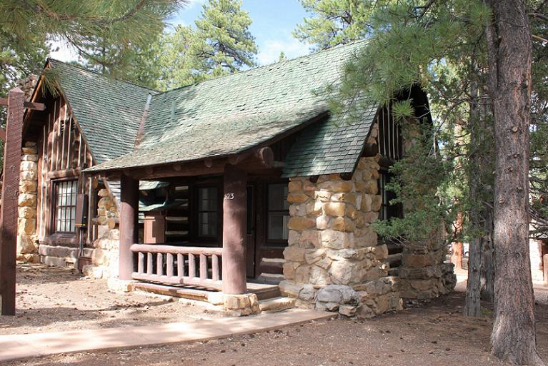 Je kunt ook in het park overnachten, daar heb je kamers en cabins (zie foto) op loopafstand van de rim, geweldig voor de zonsopgang/ondergang. Maar wel erg prijzig (hoewel je weer een nacht DPI uitspaart :wink: ).
