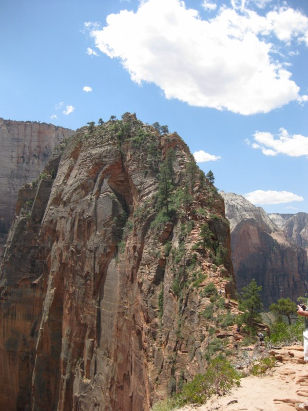 Je kijkt van op Observation Point uit op Angels Landing. Gewoon in de zomer is Angels Landing (bij normaal gedrag) ook niet echt gevaarlijk. Ja je loopt natuurlijk over een klifrand, maar wat ik daar zelf gemerkt heb is dat veel mensen die kettingen op de terugweg niet eens meer gebruiken. Als je flink wat aan kunt wat je zelf aangeeft dan valt het allemaal erg mee.