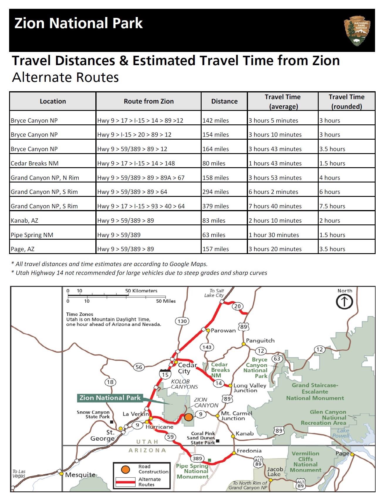 Omrijden kan vanuit Zion richting Bryce via de I-15 naar Cedar City, dan via de 14 naar highway 89 (of andersom).
