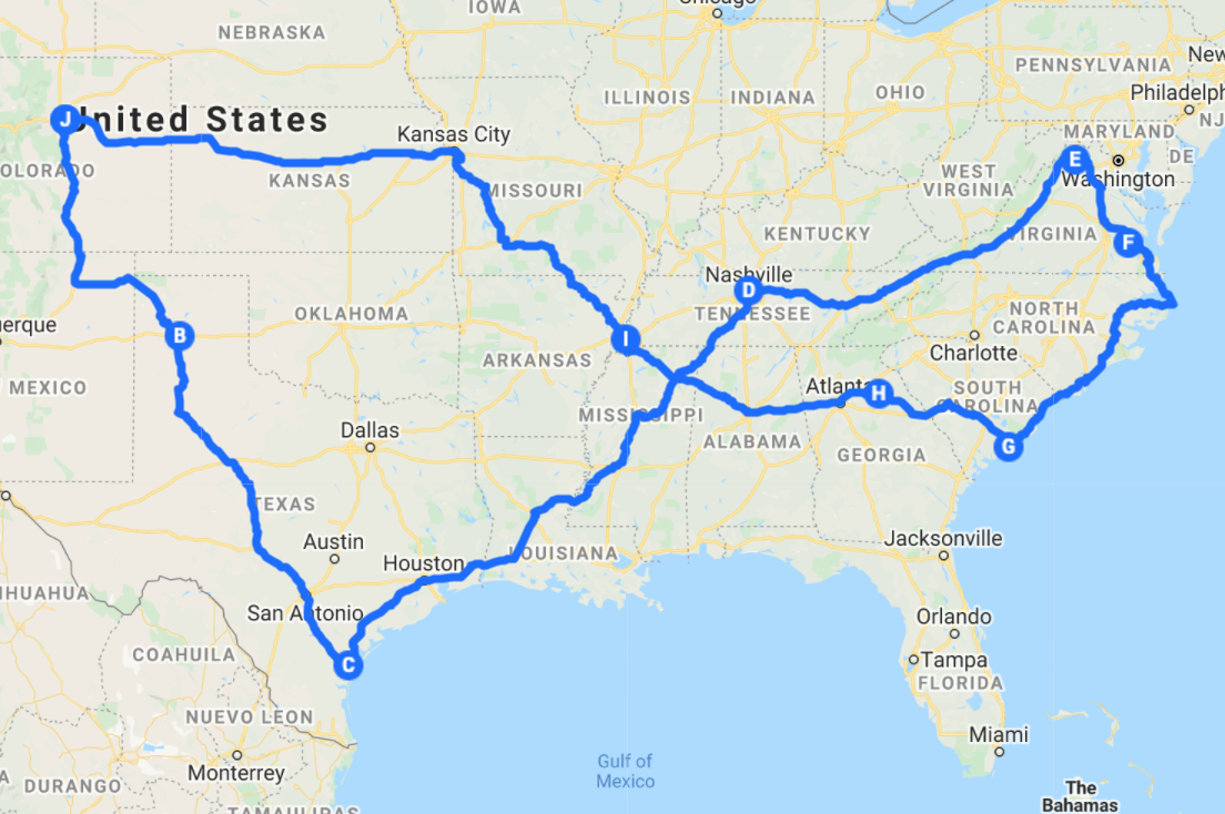 Wij zijn het opgesloten zijn nu wel een beetje zat. Aangezien het reizen naar het buitenland er voorlopig nog steeds niet inzit, gaan we maar een road trip maken. Het begon als een road trip om de verjaardag van mijn broer in Georgia te vieren, maar het is uiteindelijk een "Achtje" op zijn kant geworden (begin en eindpunt in Aurora, CO) van hier naar de oostkust en weer terug. Hoofdpunten die we willen bekijken: Boca Chica, TX (SpaceX), Natchez Trail, Jamestown VA, Charleston SC, Athens GA, Memphis TN.