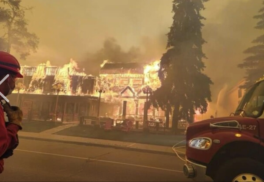 Het regende wel gisteren, maar niet genoeg om het vuur te doven. Voordat het vuur in het dorp was, ging het met 15 m. per minuut vooruit. Vlammen van 300 - 400 ft. hoog. Zelfs de brandweer moest vluchten. Ook de Icefields Parkway is beschadigd. Dat zijn ze nog aan het inventariseren.