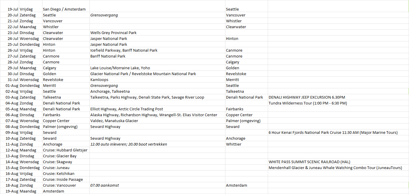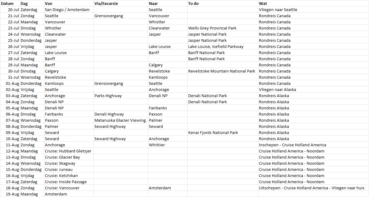 Prachtige plannen. Wij hebben in 1996 de Cruise met de oude Ms. Rotterdam gemaakt en in Anchorage een camper gepakt om weer naar beneden te reizen. Ik zie SanDiego op dag 1 staan gok dat dit Seattle moet zijn.