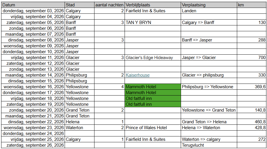 De verblijven in Yellowstone zijn bevestigd, voor de meeste andere zijn prijsaanvragen lopende.