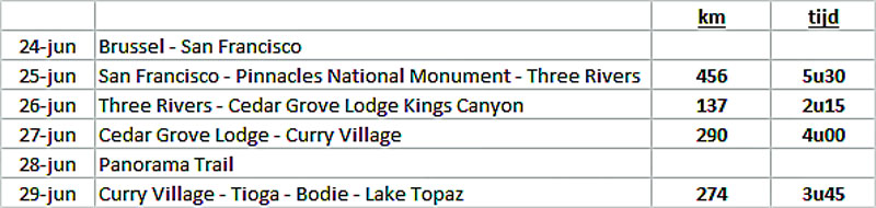 @Marianne, Q-Bic : rekening houdend met jullie, terechte, opmerkingen en na het lezen van nog wat reisverslagen en de wandelingensite van Marianne, heb ik nu volgende (deel)route uitgewerkt waardoor er, volgens mij althans, voldoende tijd is voor scenic drive én hikes in Kings&Sequoia. op 28 juni voorzie ik enkel de Panorama Trail, maar dat kan, denk ik, dan wel op een rustig tempo met eventueel nog een korte hike eens terug in de Valley. Ook de route naar Lake Tahoe werd ingekort tot Lake Topaz, zodat we op die manier ook Bodie kunnen bezoeken. We zijn nu wel een zaterdag in Yosemite, maar ach, we zullen niet de enige zijn allicht