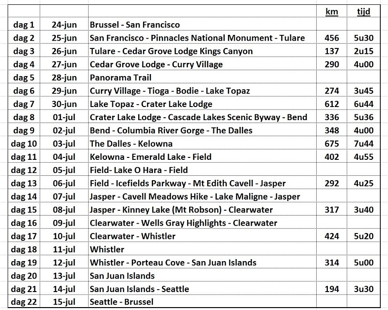De dagen 01-06 liggen vast omwille van de nog moeilijk te wijzigen logies in Yosemite (ik kijk nog uit of The Lodge nog vrijkomt)