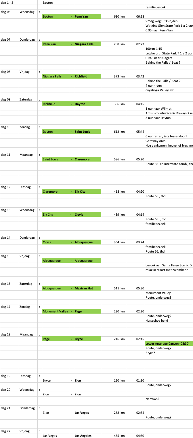 Ik zal eens wat reisverslagen opzoeken. Als ik het in bovenstaande route zou plakken vanaf Chicago, dan kom ik op 7, dat lijkt me krap.