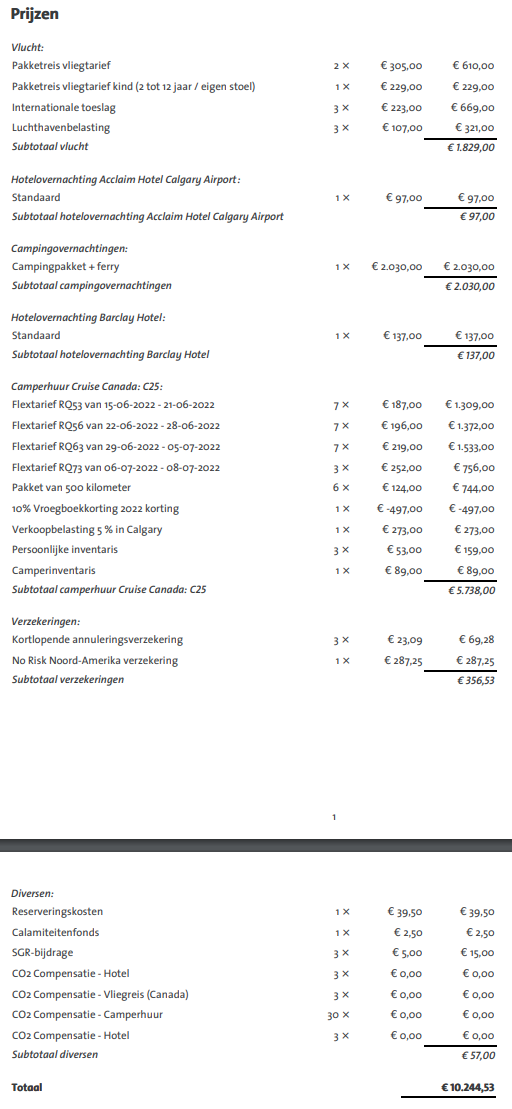 We hebben een offerte binnen gekregen voor onze trip naar Canada. Staat nu op 14 juni vertrekken en 10 juli terug en een route van Calgary via Banff, Jasper richting Vancouver Island en terugvlucht via Vancouver. We hebben de camper voor 24 nachten en 1 nacht een hotel zowel bij aankomst en vertrek. We komen totaal op 10.200 euro met een overstap of 10.600 met een directe vlucht.