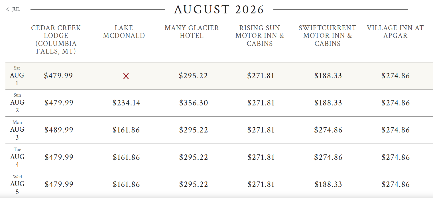 Ik zag net ook een kamer vrij in Swiftcurrent Inn voor 06.08.2025 op 07.08.2025, wellicht is dat nog een optie voor de laatste dag/nacht.