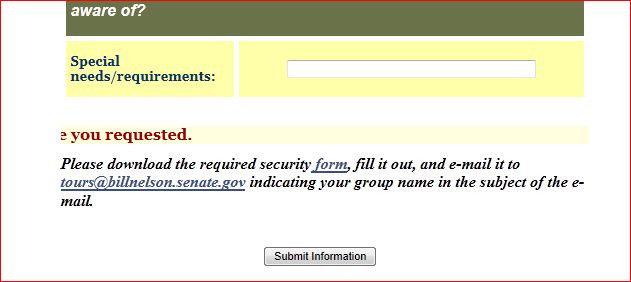 Nu ben ik terecht gekomen op de site van senator Bill Nelson en wordt ik doorgelinkt naar een aanvraag formulier voor een rondleiding in het witte huis.