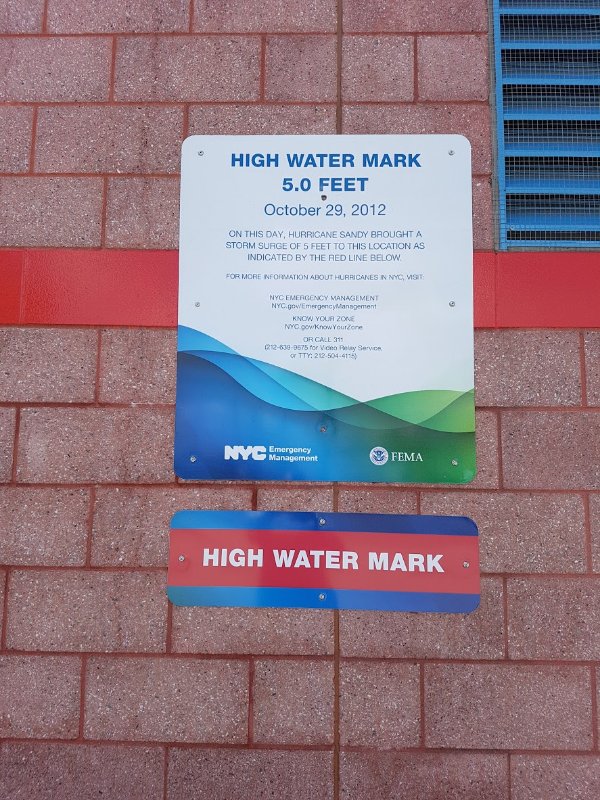 Dat bord geeft aan hoe hoog het water tijdens Sandy is gekomen op Coney Island (als aanduiding voor gevarenzones bij volgende orkanen)