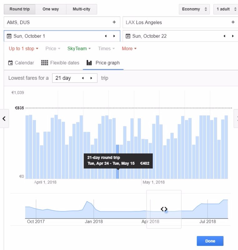 Dit zijn gewoon de tarieven die op dit moment beschikbaar zijn. Je kunt het hele aankomende jaar op en neer naar LA voor 400 euro. Alleen in juli en augustus gaat het omhoog. Als je die maanden kunt vermijden is er echt geen enkele reden om veel meer dan 600 euro retour te betalen.