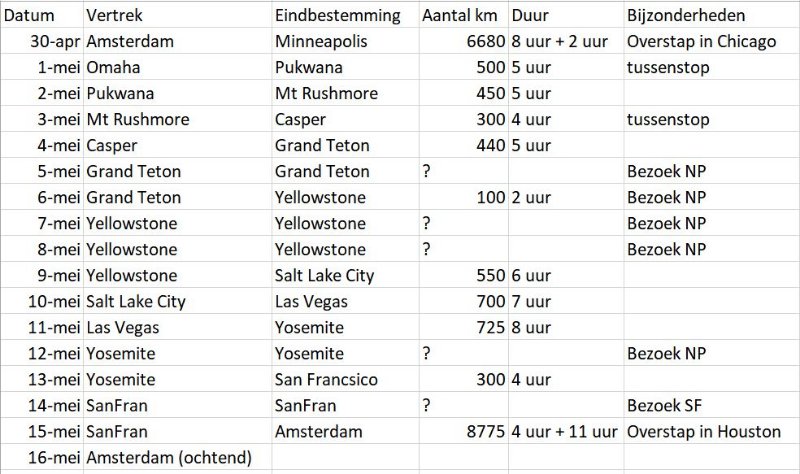 Ik zag een interessante wegbrengactie langskomen https://www.paperflies.com/getaways/uni ... oor-de-usa en ben toen even wat gaan checken en doen. Als klad ben ik tot dit schema gekomen, maar hoor graag van jullie of het realistisch is, of dat we te veel hooi op ons vork nemen. Ik heb namelijk nog nooit met een RV gereden.
