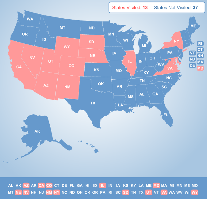 Dat zijn er al behoorlijk wat eigenlijk, en ik kijk er naar uit om volgende maand Georgia, South Carolina, North Carolina en Tennessee te bezoeken :)