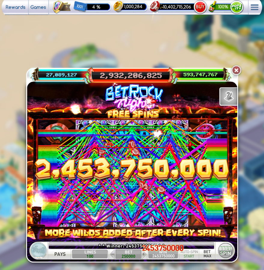 Ik won 2,2 miljard met 1 spin, het hoogst dat ik ooit met 1 spin haalde. Daarna nog eens 1,8 miljard met free spins. Toen zat ik met nog een aantal andere grote wins ineens op 6,6 miljard. Inmiddels speel ik op 12,5 miljoen per spin.