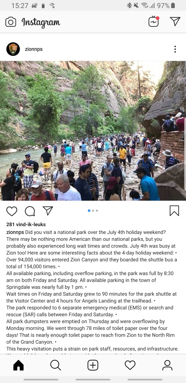 De Instagrampagina van Zion NP besteed veel aandacht aan die drukte. Zojuist weer, mbt 4th of July.