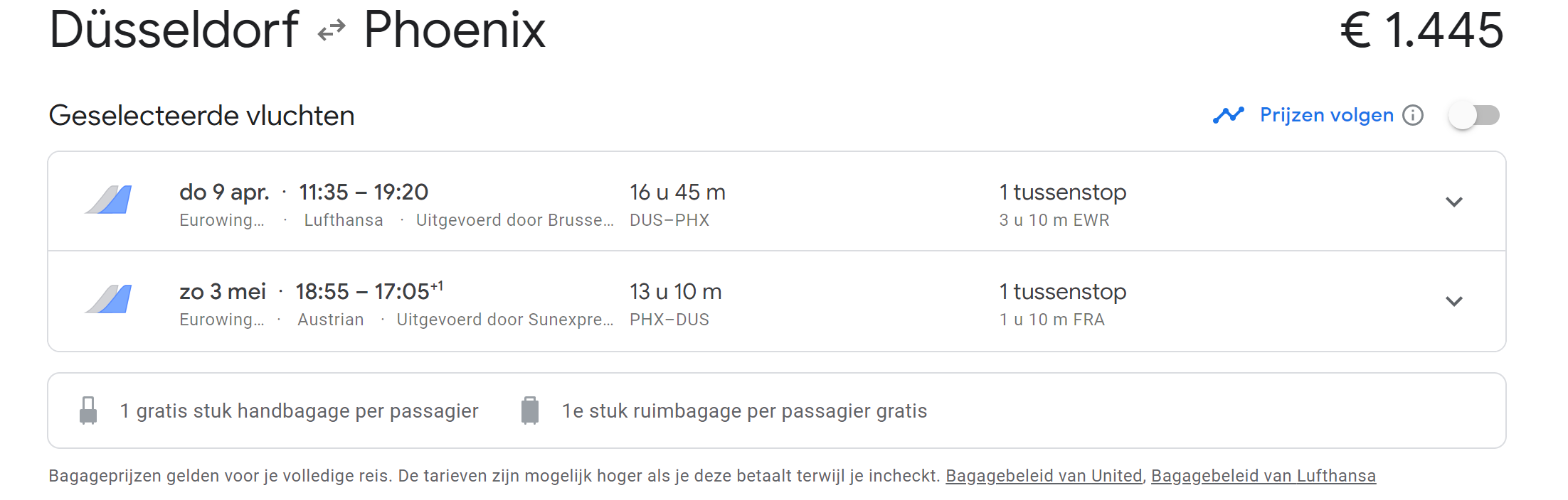 Het begint weer te kriebelen en dus weer op zoek naar tickets om in april naar Phoenix te vliegen. Zoals altijd veel verschillende prijzen, maar nu heb ik toch een vraagje, via google flights de volgende vlucht gevonden, er staat bij inclusief ruimbagage, maar kan ik er van uitgaan dat dit ook erbij zit?
