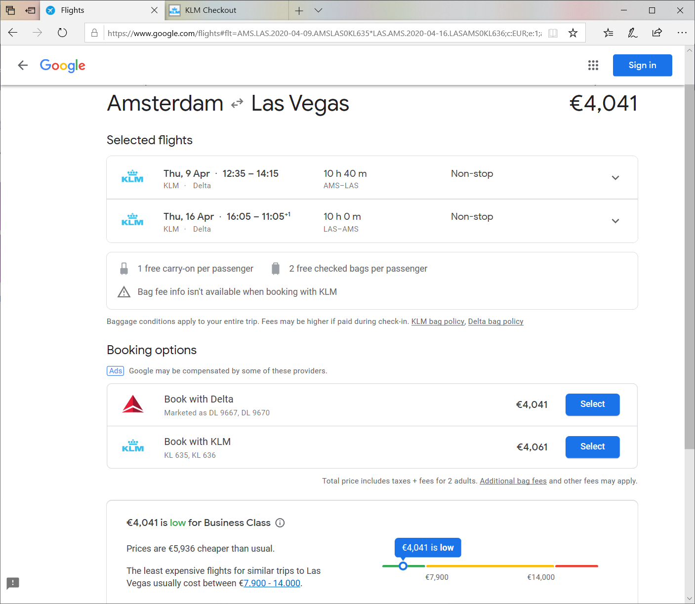 Als ik op de KLM website zoek voor twee personen retour AMS-LAS krijg ik in het kalenderoverzicht ook dat tarief als goedkoopste tarief te zien in april: vanaf EUR 4050. Dat is correct. Maar ik zie inderdaad wel wat je bedoelt, zodra je gaat doorklikken gaat de site inderdaad de mist in en zie je opeens lagere bedragen, met een "+xxxx" voor de terugreis. Niet heel netjes, vooral omdat er continu onder staat "return flight price for 2 passengers".
