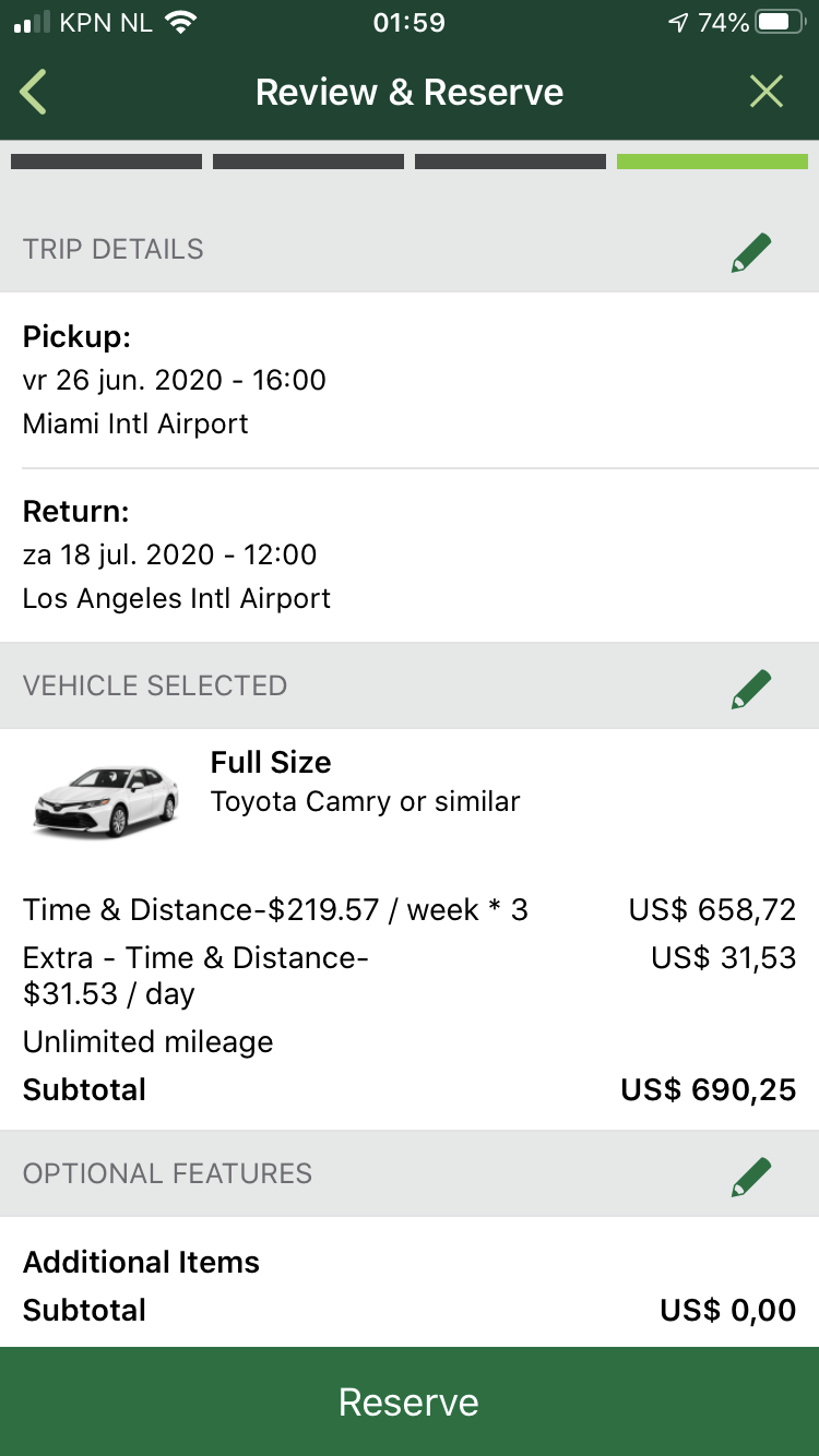 Ik heb bij national geboekt, via de app. Pick up in LA, drop off in LA.