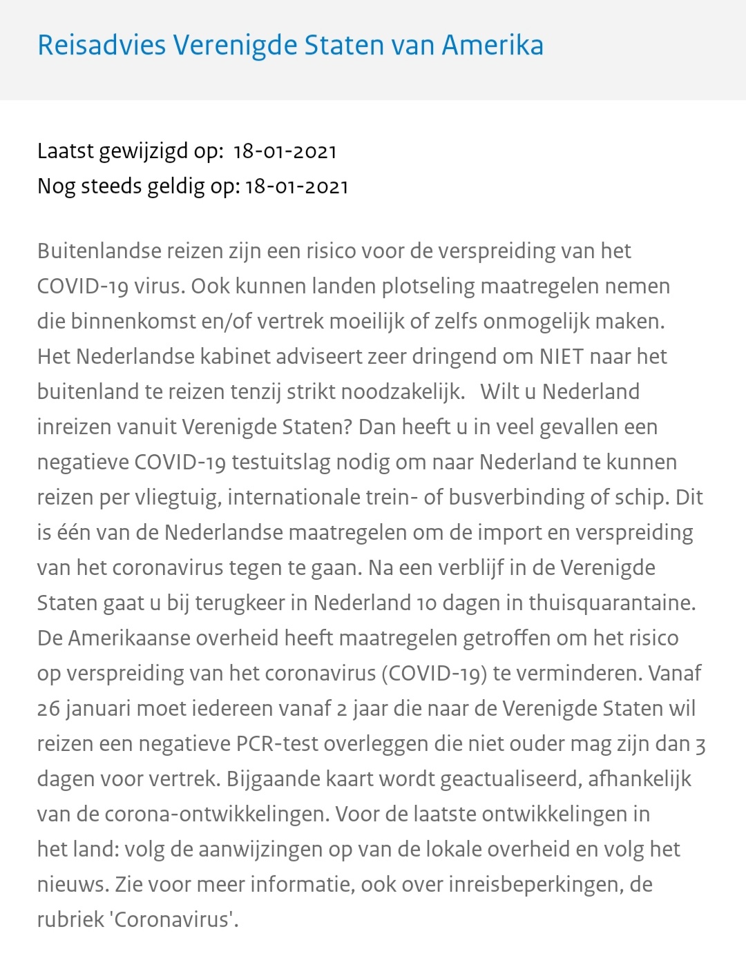 Edit: Er komen nu al berichten dat de Biden regering de boel niet wil opengooien en deze Proclamatie weer terugdraait. Nog even afwachten wat er gaat gebeuren dus.Section 1. Terminations. Proclamation 9993 of March 11, 2020 (Suspension of Entry as Immigrants and Nonimmigrants of Certain Additional Persons Who Pose a Risk of Transmitting 2019 Novel Coronavirus), Proclamation 9996 of March 14, 2020 (Suspension of Entry as Immigrants and Nonimmigrants of Certain Additional Persons Who Pose a Risk of Transmitting 2019 Novel Coronavirus), and Proclamation 10041 of May 24, 2020 (Suspension of Entry as Immigrants and Nonimmigrants of Certain Additional Persons Who Pose a Risk of Transmitting 2019 Novel Coronavirus), are hereby terminated effective at 12:01 a.m. eastern standard time on January 26, 2021.
