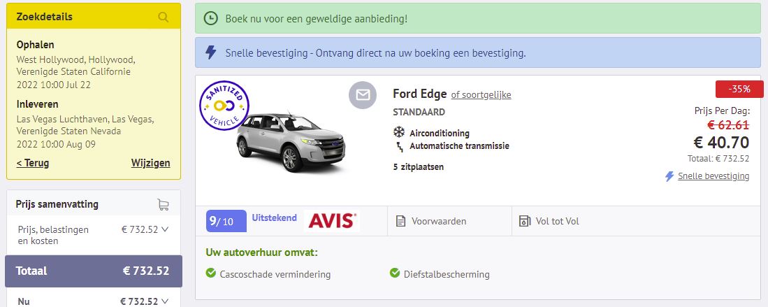 Het enige waar ik wat moeite mee heb is de zogn. 'Volledige dekking'. In mijn optiek is alles al via CDW/LIS gedekt en heb je deze dan ook niet nodig. Dan kun je voor ruim € 730 klaar zijn met een Ford Edge (mijn voorbeeld, jouw voorbeeld is € 5 duurder per dag). Wel moet je direct betalen en geldt tot 48 uur van te voren een fee van € 75 als je annuleert. Daarna een hoger bedrag of de volledige huurprijs. Annuleren is dus niet gratis!