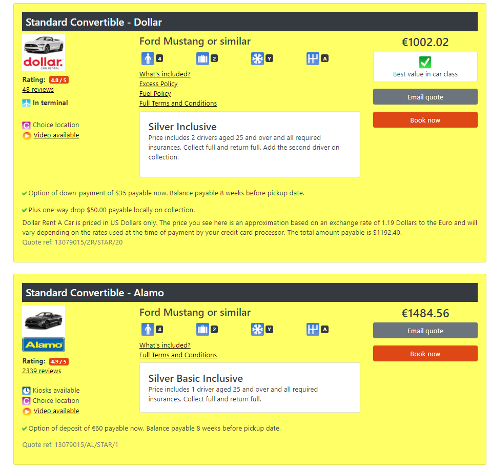 Dacht een alternatief gevonden te hebben (UScarhire). Boeking gemaakt (1049usd voor Comfort (Corolla) bij Dollar. Boeking gemaakt maar nog geen 2 uur later een bericht dat de boeking niet verwerkt was want “We are sorry but your booking has failed to book onto the Dollar system coming back with supplier reference error”. Ik reageer terug naar de dame of er andere autos beschikbaar zijn (en waarom de auto aangeboden wordt (nu nog steeds als je opnieuw zoekt trouwens) maar weinig reactie daarop (“Unfortunately, it was letting you book as if available”), en een krijg een rate terug van 1326usd voor een full size. Tja, te overwegen, maar weer via Dollar. Na boeking weer dezelfde ‘error’ ?