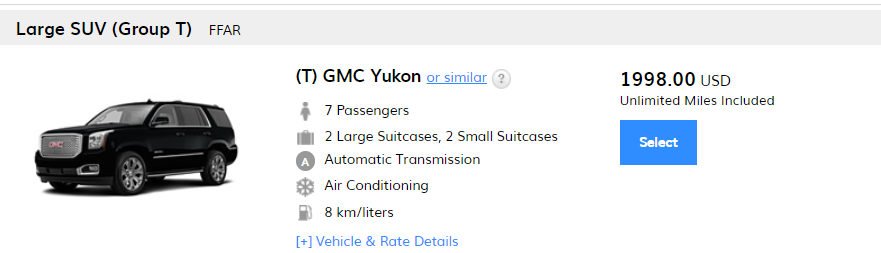 Dan zou ik toch aanraden om voor die 750 dollar 2 auto’s te boeken. Dan hou je in ieder geval 500 dollar in je zak (in vergelijking met de large SUV boeking) om dubbele brandstof van te betalen.