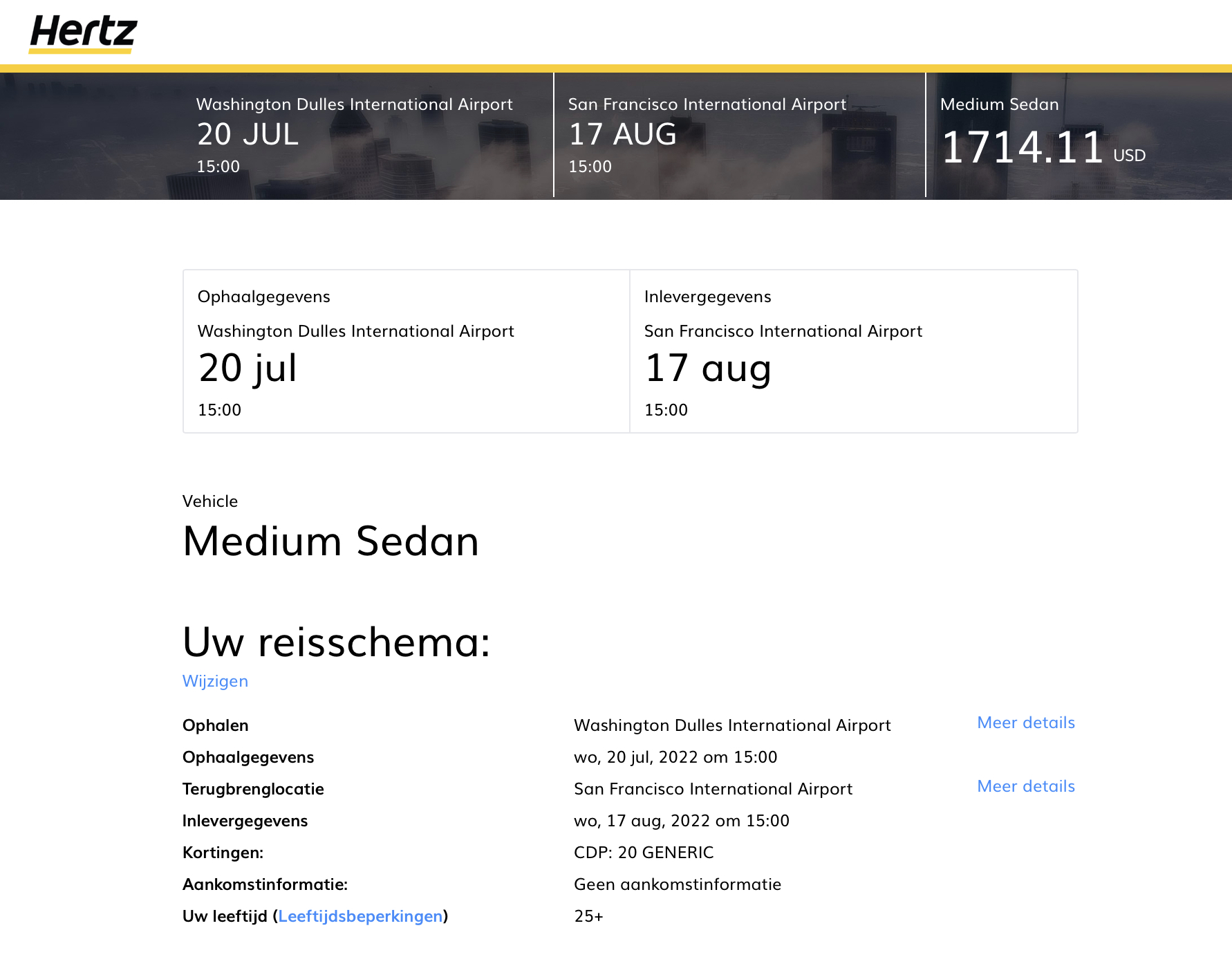 Uitleg bij het verschil in de data: aan het begin van onze reis willen we eerst een aantal dagen in Washington en New York doorbrengen. De reis tussen Washington en New York dachten we dan met de trein te doen. Pas aan het eind van ons verblijf in New York halen we de auto op en gaan we op pad. Aan het eind leveren we de auto in in SF en brengen daar dan nog 2 dagen door voor we terugvliegen (dan hebben we geen parkeerkosten). Dat is het idee en zorgt voor het verschil in data.