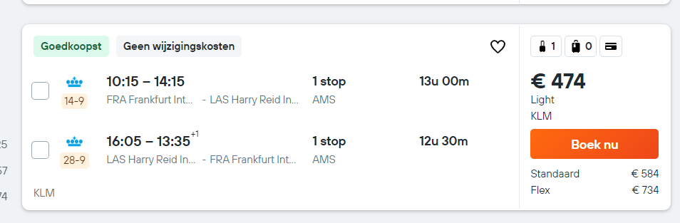 LAS - AMS - BRU met KLM, overstap 2,5u op AMS.