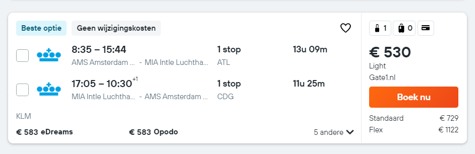 Nu zie ik dat Miami veel goedkoper is. Als ik dan 25 Okt- 13 Nov kies, is het ook 2x rechtstreeks voor 785 euro bij KLM.