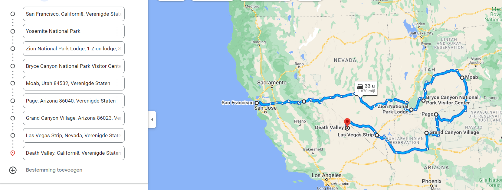 De beoogde reisduur is 16 tot 21 dagen. De voorkeur gaat uit naar natuur, maar een stad als Las Vegas of San Francisco hoort er ook wel bij. Destijds was ik onder de indruk van Zion en Yosemite, maar sta open voor suggesties.