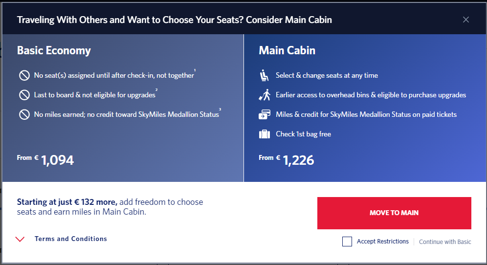 Begrijp ik het goed dat bij Delta de main cabin optie met een ingecheckte koffer is en de basic niet?