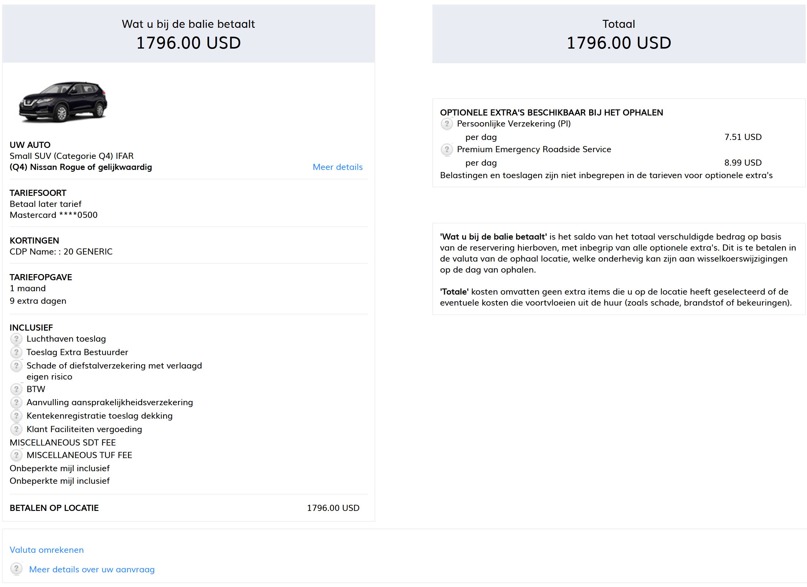 Bij National kan ik voor zelfde periode een midsize huren voor USD 1750 maar dan moet ik nog verzekering (Loss Damage WaiverSupplemental Liability Protection) erbij doen en dan kom ik uit op USD 2700. Ook niet heel tof.