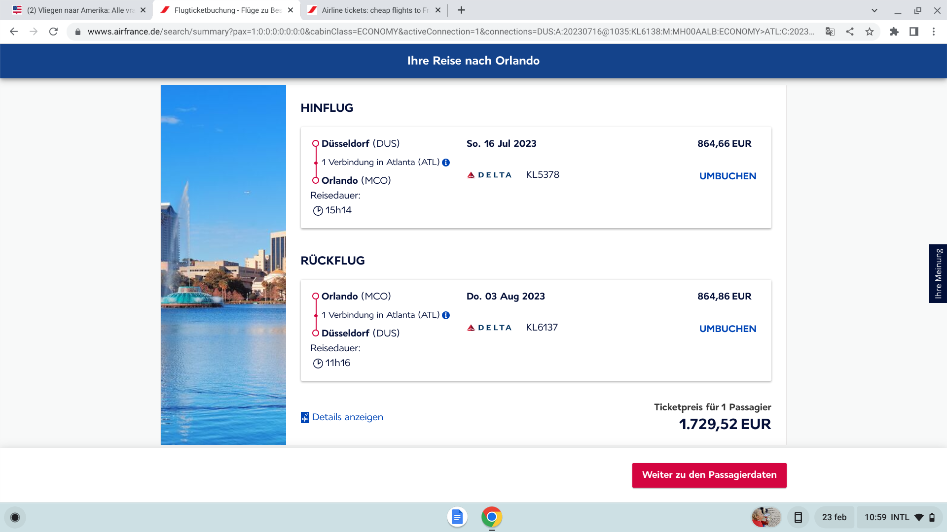 Graag gedaan! En erg nette prijs!!dmoorc schreef: ↑20 feb 2023, 17:19Met de tip van Astatic (bedankt daarvoor) via airfrance.us de vlucht met Delta kunnen boeken voor 2 juli heen, en 22 juli terug Dusseldorf-Orlando over Atlanta, voor 3p. Incl 23kg bagage per persoon en stoelreservatie…. En dit voor slechts 1748 euro (582/persoon)