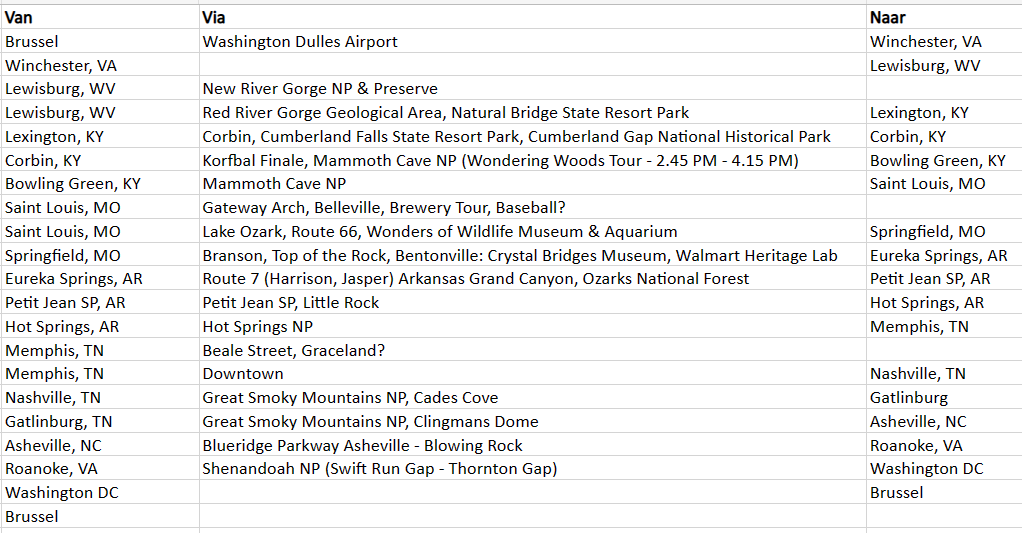 Washington DC, Shanandoah, Nashville en Smokies zijn we al geweest, daarom komen die wat kort voor in dit schema.