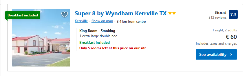 Vooral die tweede recensie is opmerkelijk. Maar ook gewone motels vragen absurde prijzen. Neem deze Super 8 in Kerville Texas